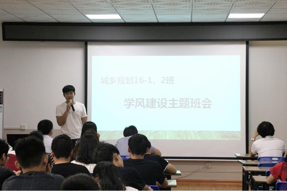 5月16日下午,城乡规划2016-1、2班全体学生在4203召开学风建设主题班会。本次班会邀请了城市规划教研室孙昌盛、陈运桥和朱莉莎三位老师及刘昌庆等三位城乡规划及相关专业的研究生学长出席。