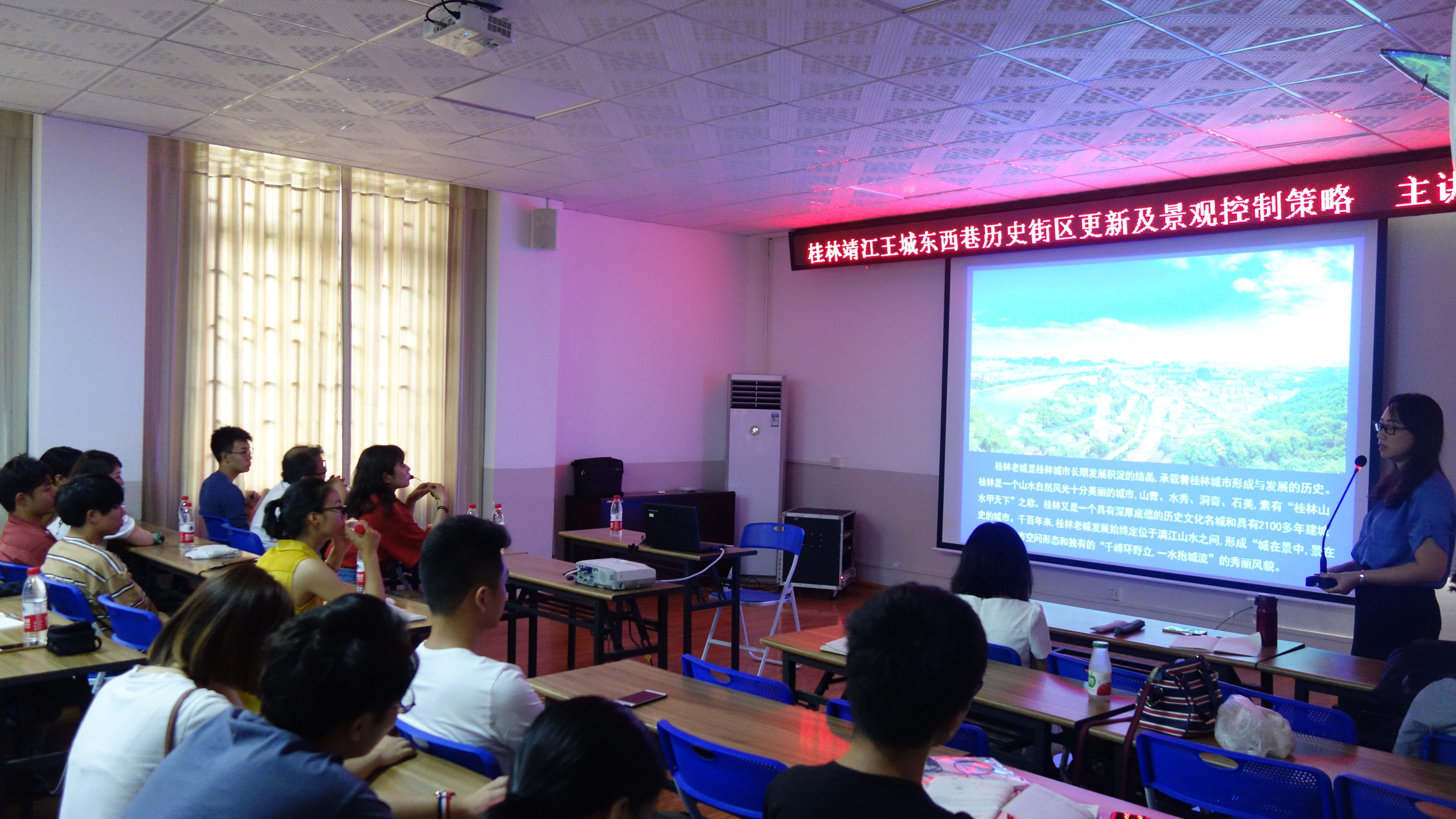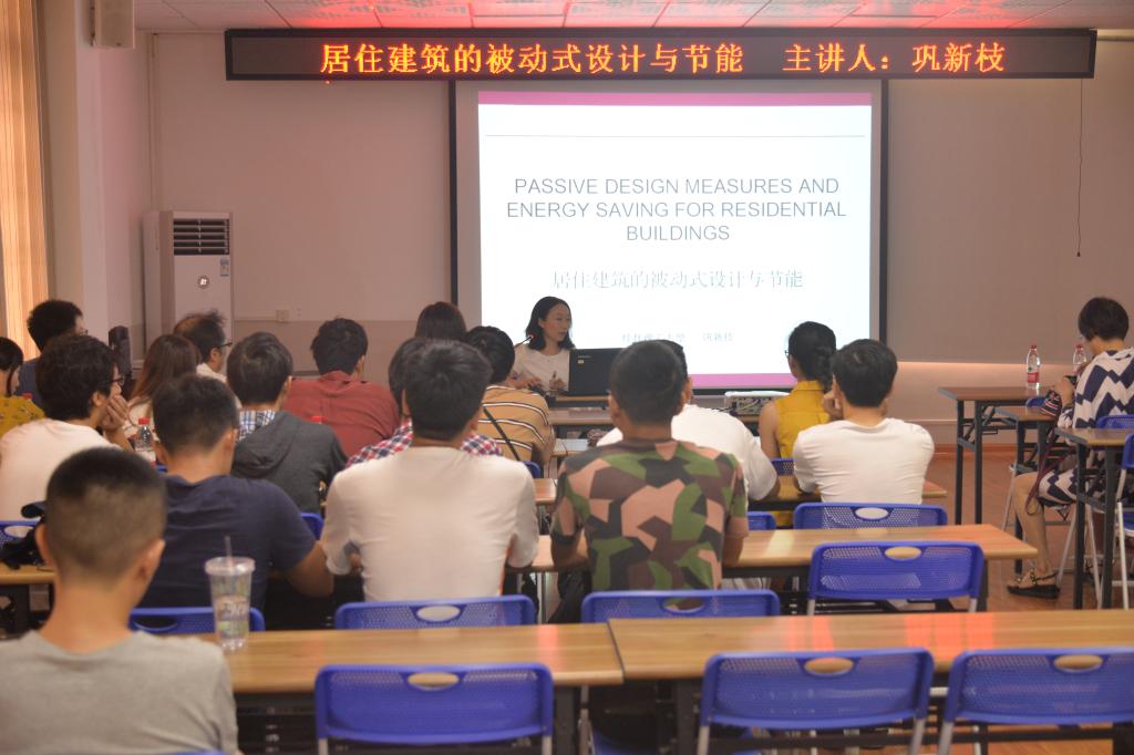 先是由巩新枝副教授主讲题目为“居住建筑的被动式设计与节能” (PASSIVE DESIGN MEASURES AND ENERGY SAVING FOR RESIDENTIAL BUILDINGS)的讲座,随后由姚斌老师主讲“桂林靖江王城东西巷历史街区更新及景观控制策略”的讲座,两位主讲人凭借着自己在求学和工作中积累的经验,以及丰富的工作和生活阅历,用生动活泼的语言、丰富多彩资料、引人深思的问题,呈现了精彩的讲座。